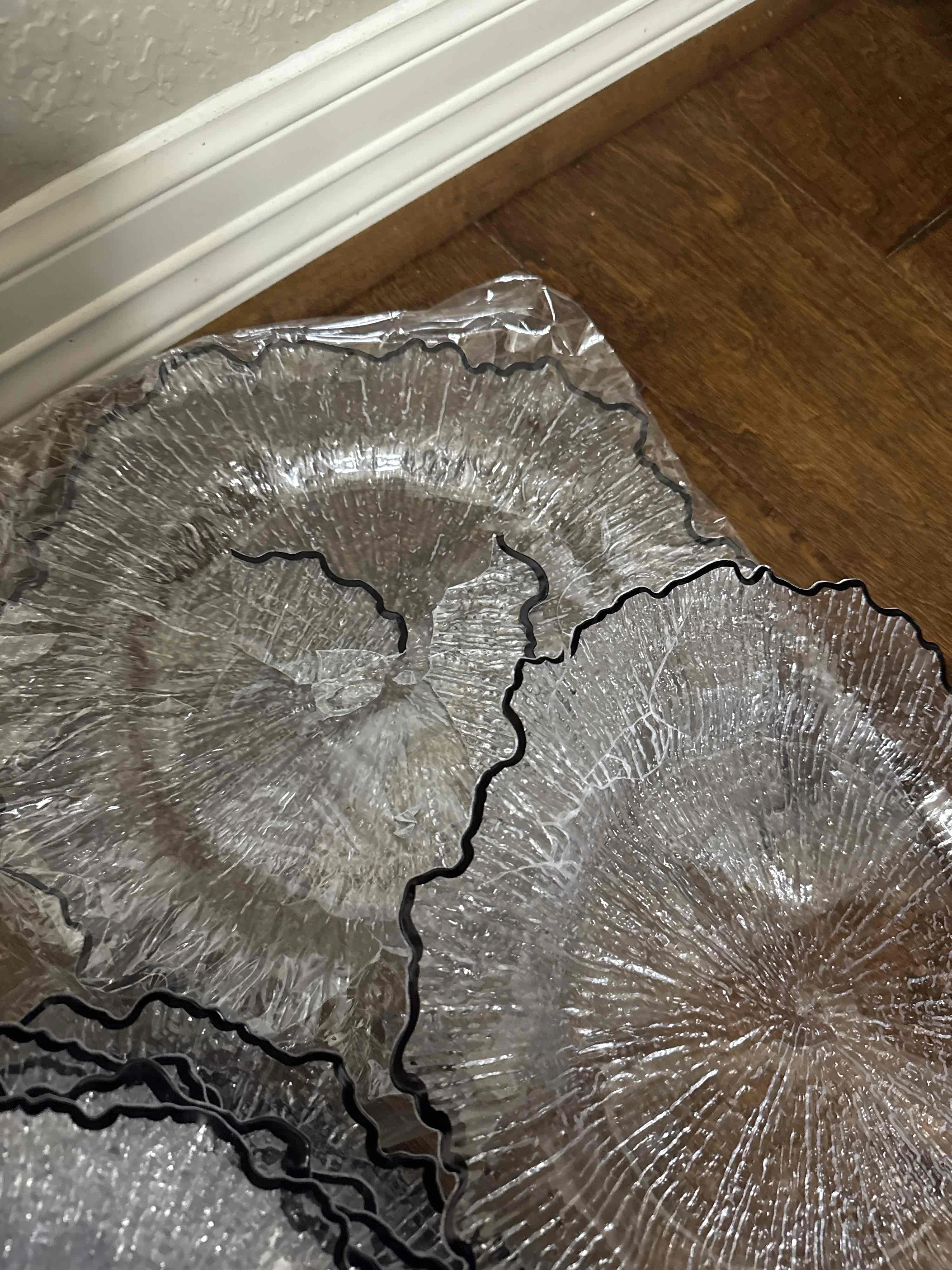 زينة حفلات الزفاف 13 بوصة تصميم زهور واضحة طبق بلاستيكي للشحن أسود اللون أطباق عشاء حواف